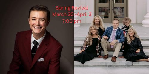 Join us for our Spring Revival March 30, 2026 thru April 3, 2026. Services will Start each night at 7:00 pm. Wyatt Austin will be bringing the message and The Rogers Family will be singing each night.